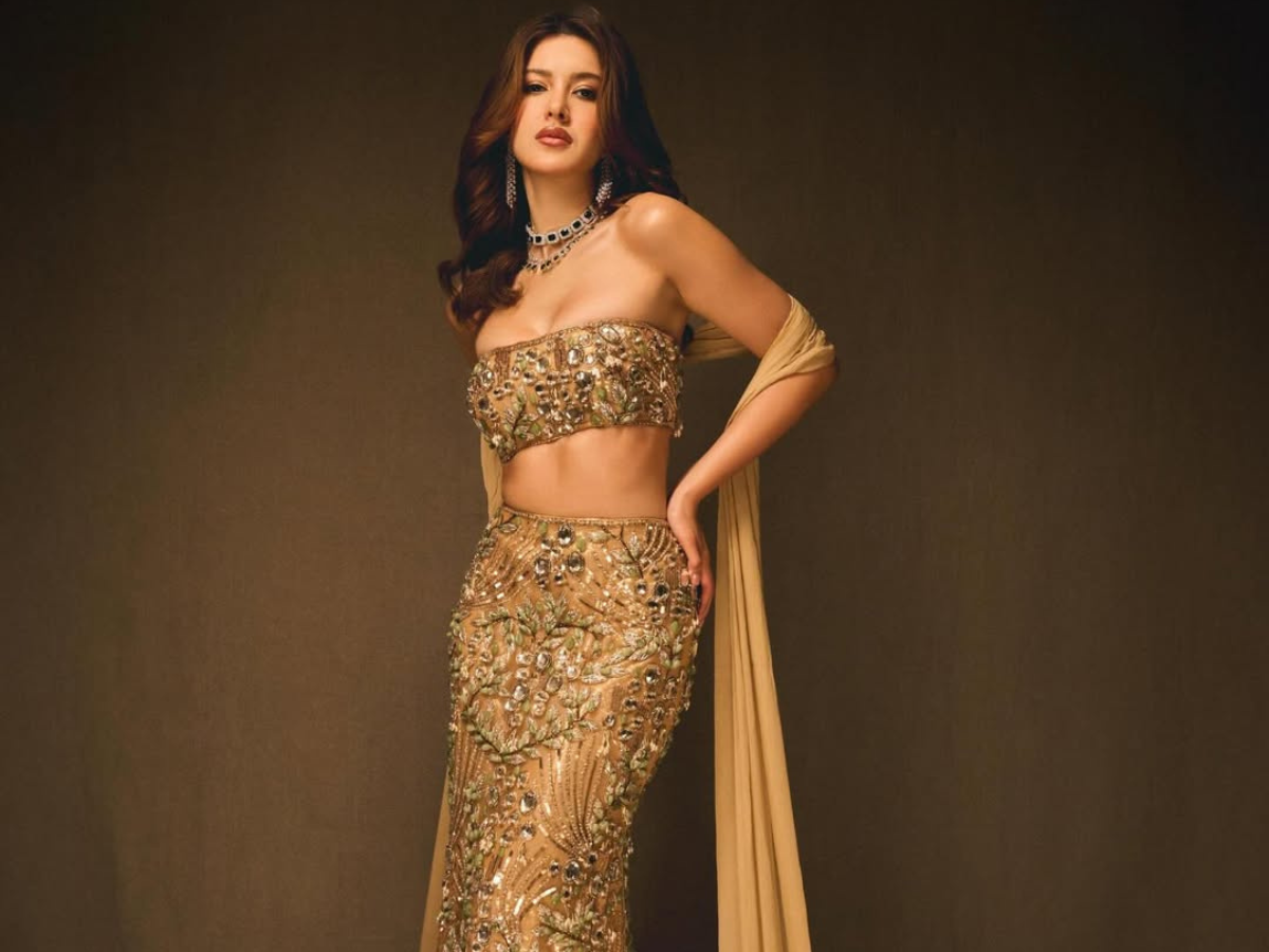 A heavily embellished blue lehenga adorned with shimmering crystals offers a bold yet refined aesthetic. Paired with a strapless blouse and shaded dupatta, the look balances modern