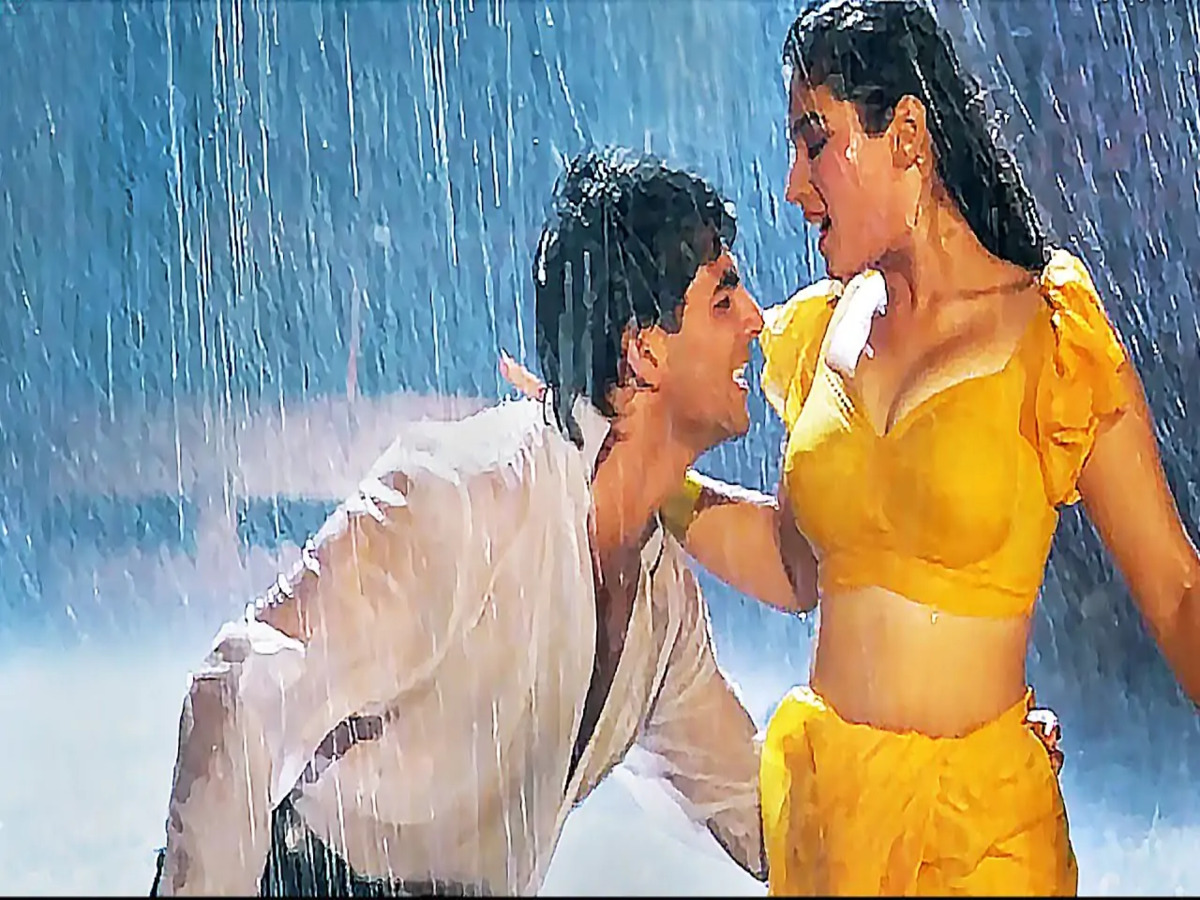This striking image captures Raveena Tandon performing in the classic Bollywood song "Tip Tip Barsa Paani" from the film Mohra. The scene features Raveena dancing gracefully in the rain, showcasing her expressive movements and the sensuous choreography that made this song a timeless favorite. The vibrant colors and dynamic energy of the moment highlight the essence of Bollywood romance and allure.