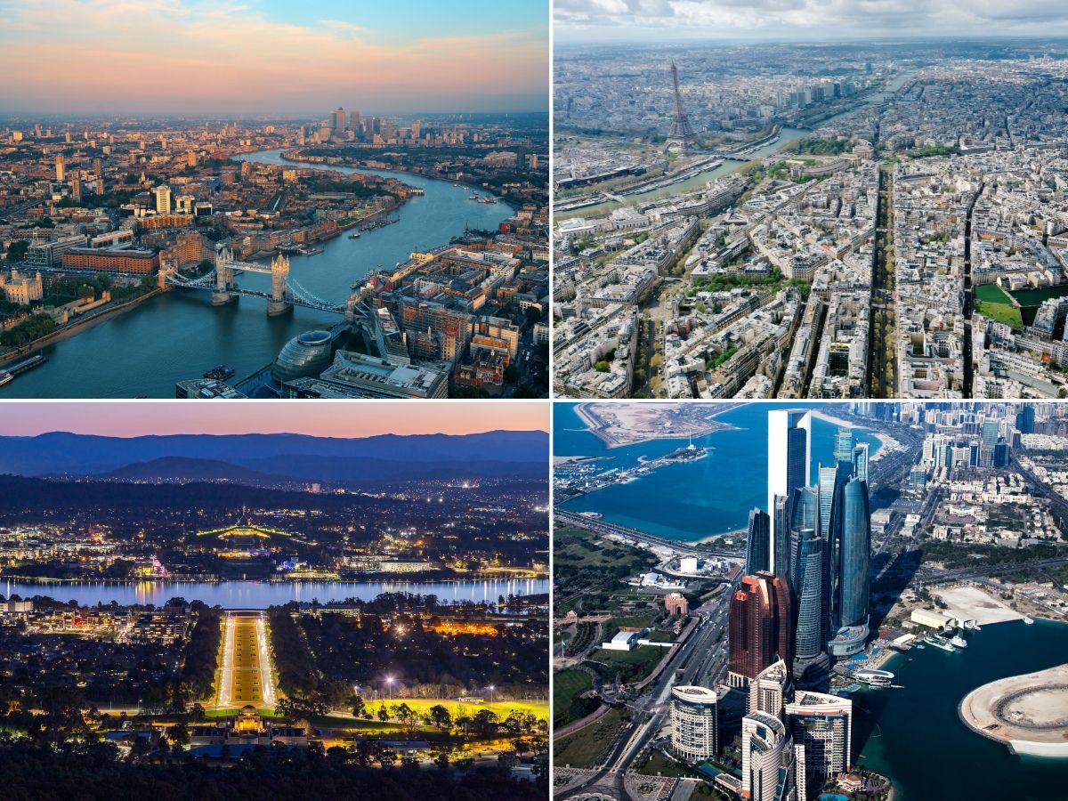 What does power look like from above? These stunning aerial shots of capital cities offer a new perspective on the seats of governance, history, and culture. From the golden glow of New Delhi’s stately avenues at night to the intricate geometry of Canberra’s planned layout and the timeless charm of Paris’s skyline, these capitals showcase their stories best from the sky. Take a soaring journey across continents as we look at 10 cities that shape the world from above.