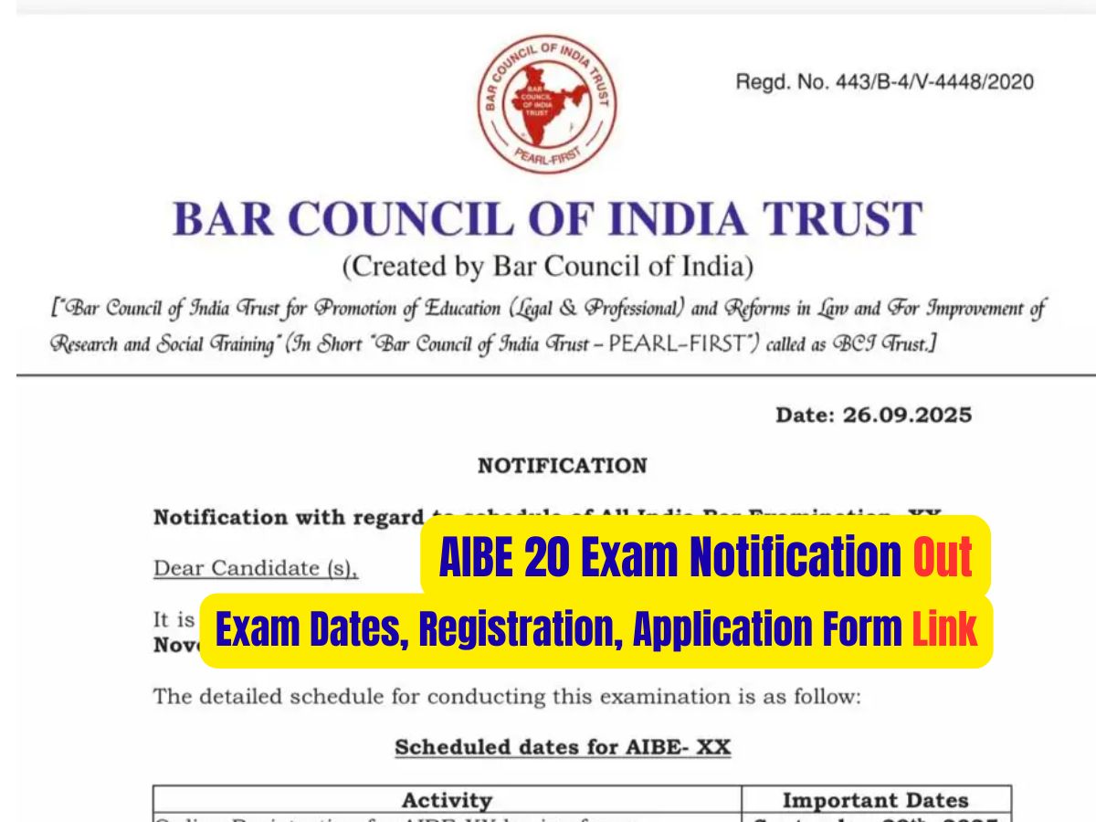 AIBE 20 Examination: The Bar Council of India has recently released the AIBE XX examination dates on its official website, allindiabarexamination.com. As per the official Notification, the AIBE 20 registration 2025 process will begin from September 29, 2025. Those who have completed a three-year or five-year LLB degree, as well as final students without any backlogs, are now eligible to appear for the AIBE 20 exam.